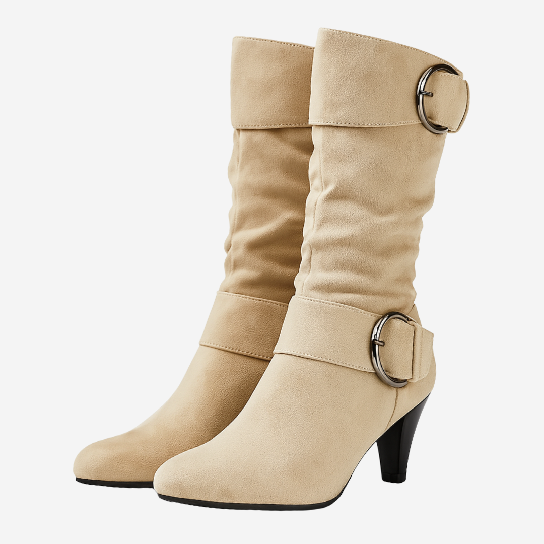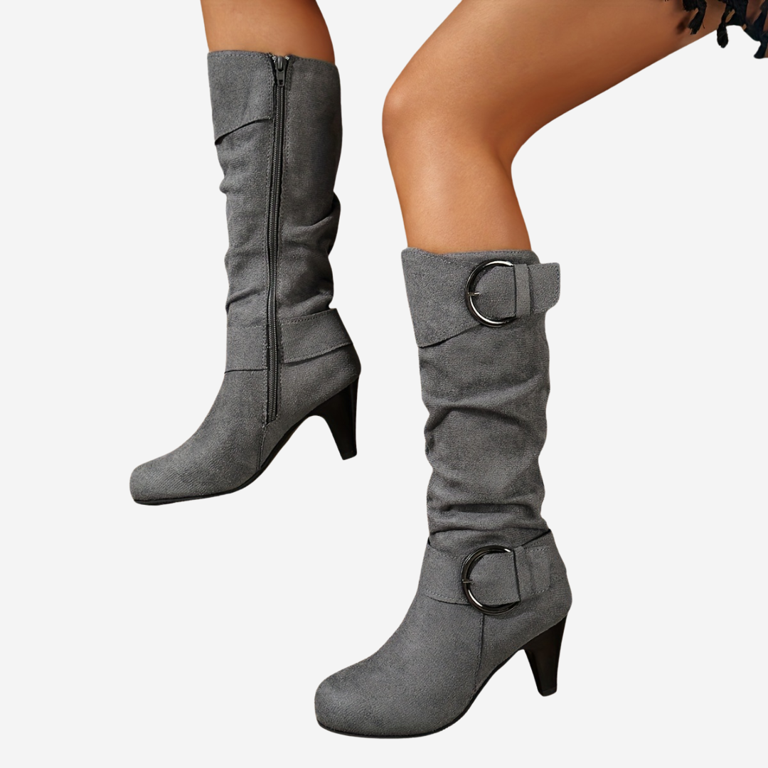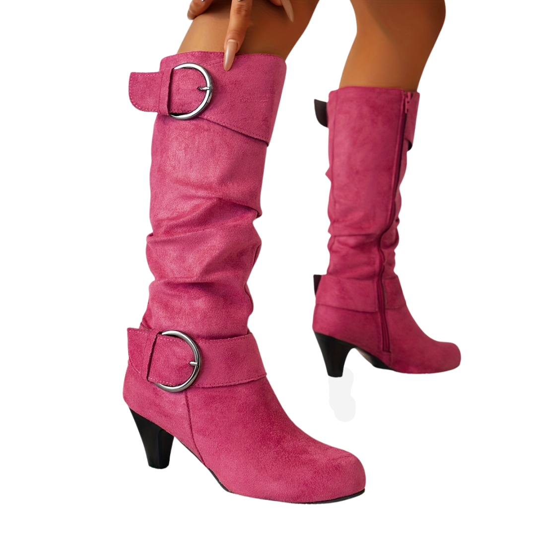 Bold Buckle Detail Knee-High Boots with Sculpted Heel!