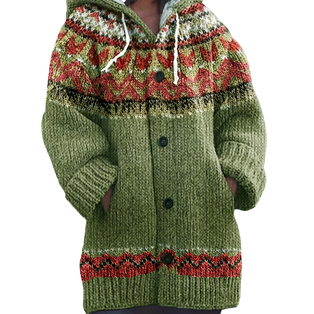 Stay cozy and stylish with the Jennie Sweater, featuring a warm hood, Fair Isle pattern, and button-front design β perfect for layering on chilly days.